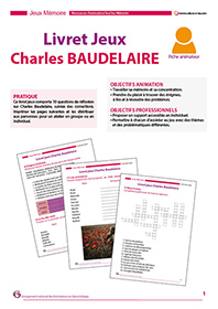 2021 célèbre les 200 ans de la naissance de Charles Baudelaire (né en 1821). Deux contenus fêtent le poète : une biographie suivie d’un atelier photos/discussion et un livret jeux. Le livret-jeux comportent 11 questions, mots croisés, énigmes, poèmes à trous… De quoi ravir les passionnés de Baudelaire. Les réponses sont données à la fin du livret. Ces contenus conviennent à des animations individuelles.