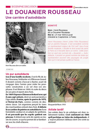 La vie du peintre. L'histoire de sa peinture et son évolution avec les œuvres qui ont marqué sa carrière. La biographie est complétée d'un quizz photos comprenant 5 questions sur l'artiste accompagnées de photos. Un support adapté à une animation individuelle.