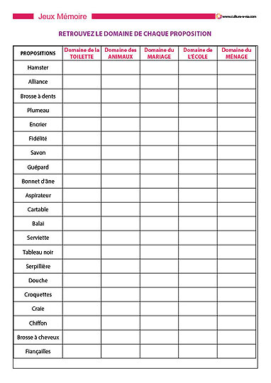 'description' => '<p>Catherine propose ici un jeu de réflexion abordable par un large public. Des thèmes (animaux, route, banque, médecine…) sont proposés dans une grille. Une grille de mots est notée en parallèle et le principe consiste à retrouver la catégorie de chaque mot. Ce support est décliné en 5 grilles abordant des thèmes différents. A faire en travail individuel sur papier ou en groupe puisque nous avons adapté ce jeu en version diaporama.<br /><strong>Un support adapté à une animation individuelle</strong></p>'