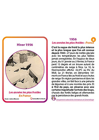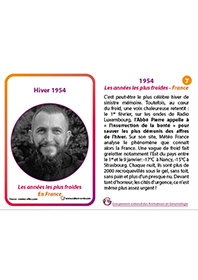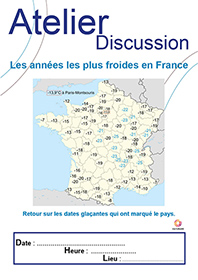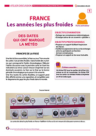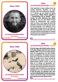 Ce support permet de mettre en place un atelier-discussion très visuel à l’aide d’une frise chronologique. 13 cartes reviennent sur les grands froids non sans conséquence en terme de pertes humaines, du XVIIe siècle à nos jours. Ces cartes sont à afficher sur une frise chronologique et peuvent faire l’objet d’une exposition temporaire au sein de l’établissement.