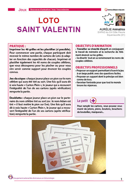 Aurélie propose un loto dédié aux couples célèbres pour fêter la Saint Valentin. Vous retrouvez 20 couples célèbres répartis sur les grilles, dont Roméo et Juliette, Bonnie et Clyde, Prince Charles et Lady Di et bien d’autres ! Un bon support pour allier jeu et fête.