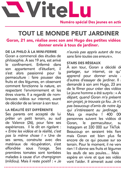 Notre partenaire ViteLu, la référence en matière d’actualité facile à comprendre, partage ici deux journaux : un est dédié à l’actualité positive (un 1er est paru en juin sur CULTUREàVIE) et l’autre cible des jeunes en actions. Vite lu Séquoia est un journal support à l'animation d’ateliers revue de presse, écriture, mémoire... Il informe et favorise l'expression et le lien social dans les Ehpad, foyers d’hébergement, accueils de jour, à domicile...
