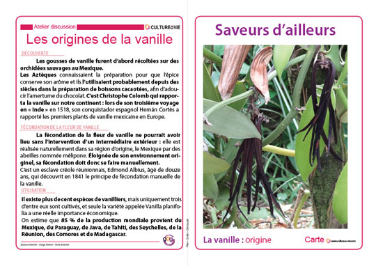 Mieux connaître ces nouvelles saveurs venues d’ailleurs comme la vanille est ce qui a motivé Agnès à développer des supports à partir de l’histoire de cette épice. Trois cartes permettent de découvrir l’origine, la transformation et l’utilisation de cette plante. Un diaporama quiz et une grille de mots croisés viennent compléter les cartes « histoire » pour partager ses nouvelles connaissances. N'oubliez pas de "dezipper" le diaporama avant de le lancer.
