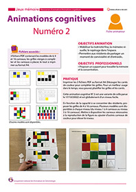 Ce contenu d’animation est adapté à des personnes présentant des troubles cognitifs de type Alzheimer. Il permet de faire fonctionner la mémoire visuelle et le repérage dans l’espace. Il fait également appel à la motricité. Seul ou en groupe, les résidents partageront un moment de convivialité et d’entraide. Ce contenu sur les carrés de couleurs est une variante de la première animation cognitive proposée en octobre 2022.