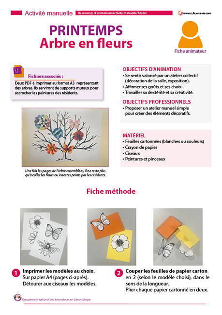 Ce support contient des arbres ainsi que des fleurs et des insectes à télécharger pour permettre aux résidents de réaliser facilement des décorations printanières uniques et de les afficher pour décorer l’établissement. Plusieurs modèles sont à imprimer pour faciliter la réalisation des plus créatifs. Cet atelier peinture est facile et invite à laisser libre court à son imagination et à sa créativité.