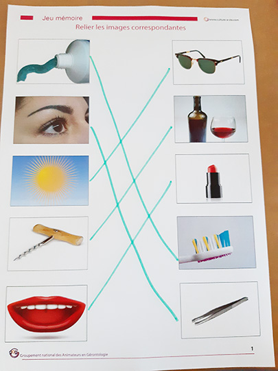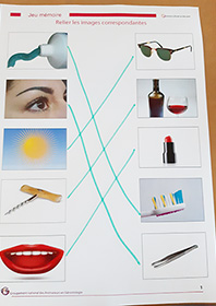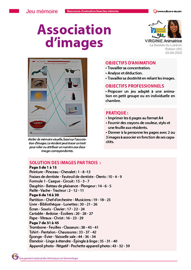Ce support d’animation proposé par Virginie propose d’associer 2 ou 3 images liées au même thème (2 : brosse à dent et dentifrice, soleil et lunettes de soleil, 3 : éponge avec vaisselle sale et évier, partition, chef d’orchestre et musiciens…). Avec 3 planches de 2 images et 3 planches de 3 images, ce contenu d’animation s’adapte aux capacités des personnes.