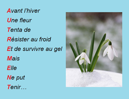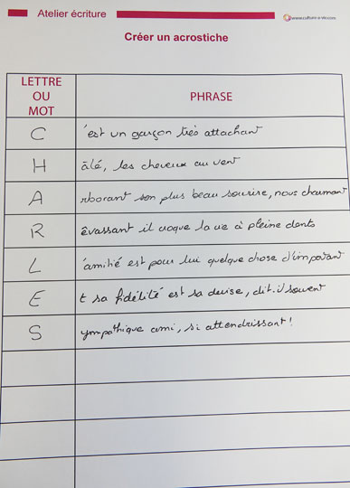 Mis en place dans le cadre des animations crées par le dispositif Culture Bleue de la Bibliothèque départementale, cet atelier d’écriture consacré à l’acrostiche permet de réaliser un atelier écriture. Une fiche méthode vous aidera à créer des acrostiches par prénom ou par thème.