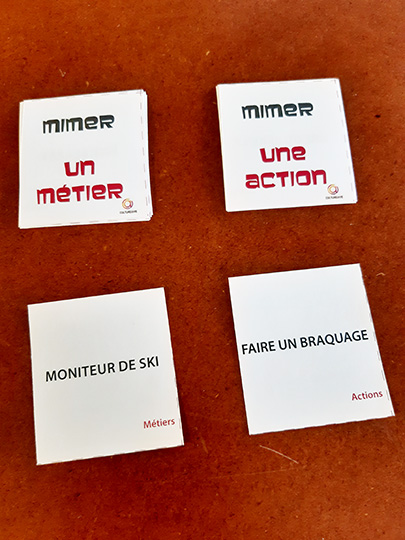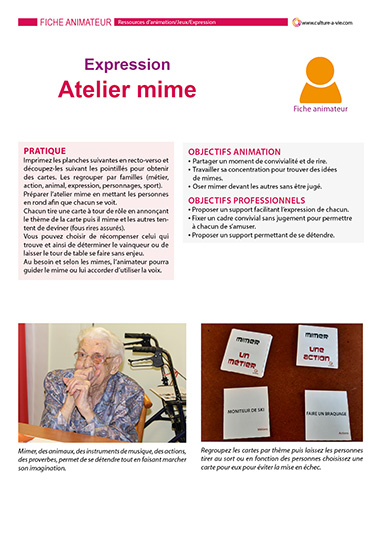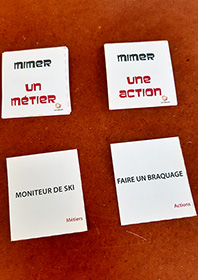 Vous trouverez ici des cartes à imprimer pour mettre en place un atelier mime. Actions, expressions, animaux, métiers, personnages, sports, sont autant de thèmes déclinés ici pour diversifier les mimes tout en assurant le rire et la convivialité.