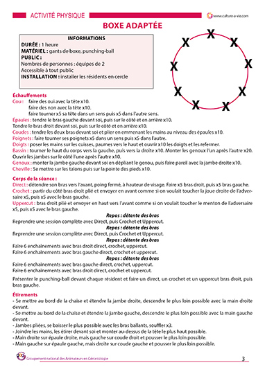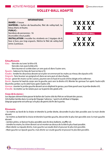 Ludivine propose des fiches de mise en place d’ateliers de sports adaptés. Basket, boxe, volley-ball et badminton sont ainsi détaillés avec échauffement, corps de séance et étirements pour chaque atelier de sport. Ces séances visent à renforcer le tonus musculaire afin de conserver un maximum d’autonomie.