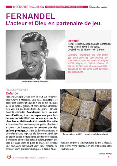 L’année 2021 marque le cinquantième anniversaire de la mort de Fernandel. Cette biographie rend hommage à l’artiste. Elle est suivie d’un atelier photo discussion. Pour compléter l’animation, vous pouvez télécharger le quiz, « les partenaires féminines de Fernandel ».