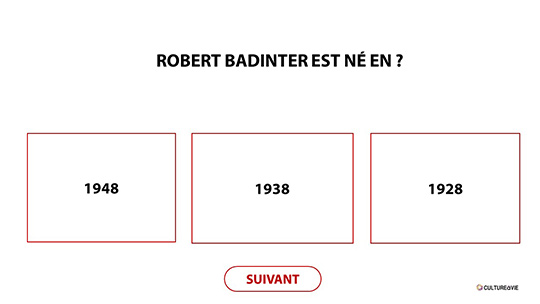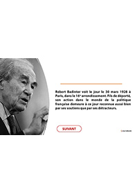 Ce support de discussion est consacré à la vie de Robert Badinter. L’avocat et homme politique, connu entre autre pour son combat pour l’abolition de la peine de mort est décédé le 9 février 2024. Le diaporama proposé ici permet de retrouver les grandes étapes de sa vie à travers des questions suivies de réponses à choix multiples.