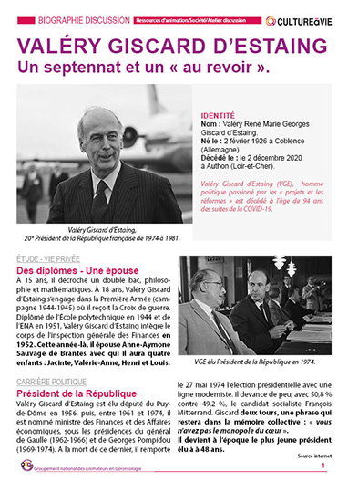 Suite au décès de l'ancien Président de la République Valéry Giscard d’Estaing survenu le 2 décembre 2020, retrouvez dans cette biographie les faits marquants de sa carrière politique. Ce support vous permettra d'alimenter les échanges autour de réformes politiques importantes dont il est l’auteur. Une fiche question à la fin de la biographie vous permettra de tester les connaissances des aînés sur la vie de cet homme publique.