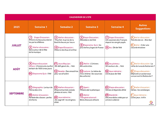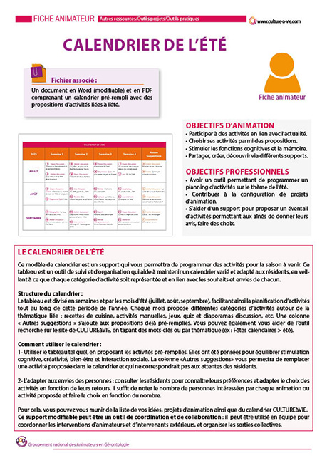 Prérempli pour les mois de l'été, ce calendrier à imprimer présente 24 contenus d'animations. Il servira à mettre en place des ateliers discussion ou activités manuelles où les participants pourront s'exprimer sur le thème de l'été. Ce support modifiable peut être personnalisé selon les envies de chacun. Ce tableau est un outil de recueil et d'organisation qui aide à maintenir un calendrier varié et adapté aux attentes des résidents, en veillant à ce que chaque catégorie d'activité soit représentée et en lien avec les souhaits et envies de chacun.
