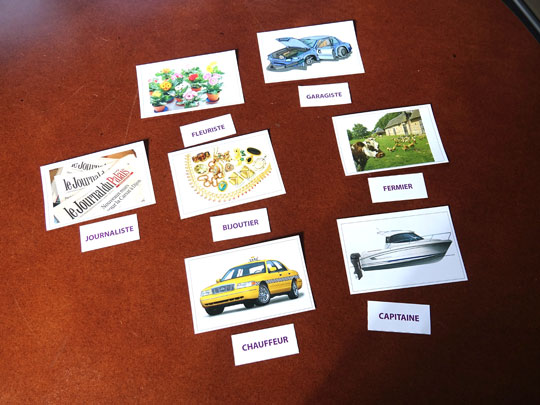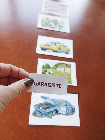 Sophie a créé des cartes représentant des métiers à retrouver. Les noms de métiers sont proposés aux résidents qui doivent retrouver la carte métier correspondante. Ce support est adapté aux personnes présentant des troubles cognitifs type Alzheimer.