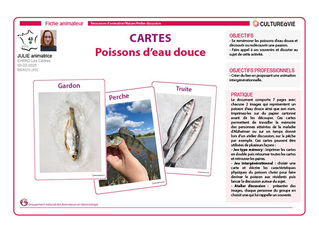 Ce support d’animation proposé par Julie est composé de 14 cartes contenant une photo de poisson d’eau douce, permettant de vérifier les connaissances de chacun sur ces animaux connus de tous. Ce support a été conçu pour échanger, réagir et/ou à partager. Une bonne occasion également pour engager la discussion et l’échange de souvenirs sur les parties de pêche en famille. Vous pouvez compléter ce support avec nos quiz dédiés aux poissons de rivière ou à la mer.