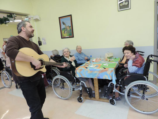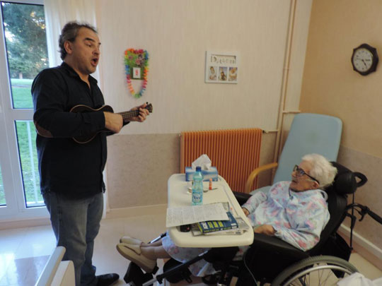 Philippe propose plusieurs types d’interventions autour de la musique en fonction des souhaits des animateurs et des résidents. -Animation d'ateliers de chansons pour préparer un spectacle avec les résidents (choix des chansons avec eux, travail de la voix, des chœurs, puis présentation aux autres résidents de l'EHPAD). Il faut au moins trois séances de préparation pour ce type de prestation. -Animation dans les chambres avec chant et accompagnement guitare/Ukulélé pour les personnes ne pouvant se déplacer. -Animation musicale plus traditionnelle dans la version « chanter pour eux » autour de chansons connues en déambulation dans la salle à manger. Temps d’intervention : 1h15 sur la version « chanter pour eux » Zone d’intervention : Toute la France (avec frais de déplacement) Recommandé par Résidence du Puy Martin au Palais sur Vienne (87), Ehpad de Feytiat (87), Ehpad du Mas Rome (87) Tarifs : 230€ (50€ de l’heure pour la version « chanter avec eux » Contacts : p.lars@numericable.com / 06 60 75 11 74