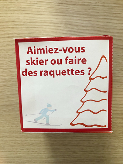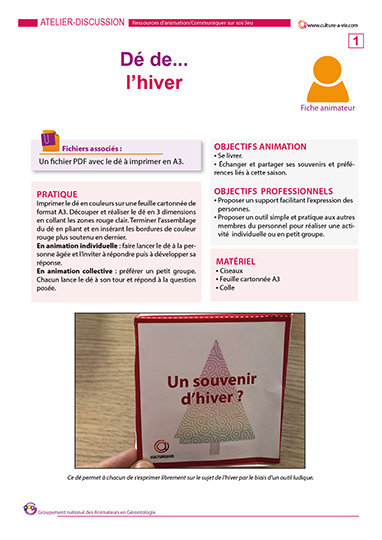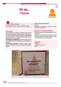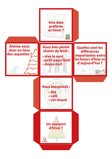 Ce dé à confectionner en carton permet de passer un moment convivial autour du jeu. Conçu pour être utilisé en individuel afin d’échanger sur un thème donné (ici l’hiver), ce jeu peut également être utilisé en petit groupe afin d’ouvrir les échanges. Le principe est simple, on lance le dé et on répond à la question sur le thème de l’hiver en partageant un souvenir, une préférence ou une anecdote.