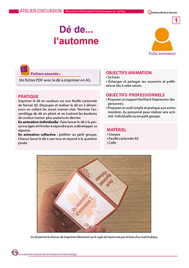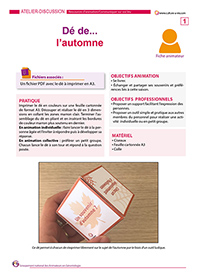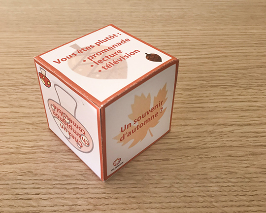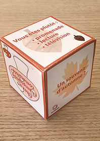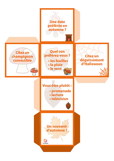 Ce dé à confectionner en carton permet de passer un moment convivial autour du jeu. Conçu pour être utilisé en individuel afin d’échanger sur un thème donné (ici l’automne), ce jeu peut également être utilisé en petit groupe afin d’ouvrir les échanges. Le principe est simple, on lance le dé et on répond à la question sur le thème de l’automne en partageant un souvenir, une préférence ou une anecdote.