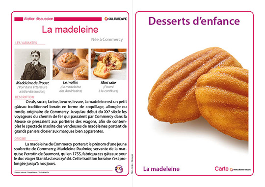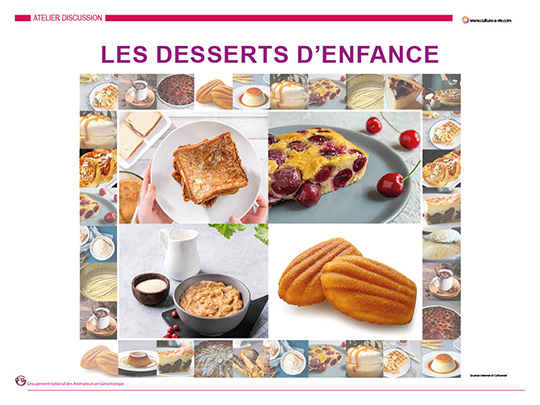 Un diaporama complété de cartes détaillées vous permettront de lancer un atelier-discussion sur les desserts d’enfance. Madeleine, beignets, semoule… autant de desserts savourés en famille ou confectionnés pour les enfants qui réveilleront des souvenirs de recettes ou de moments familiaux à partager avec le reste du groupe. N'oubliez pas de "dezipper" le diaporama avant de le lancer.