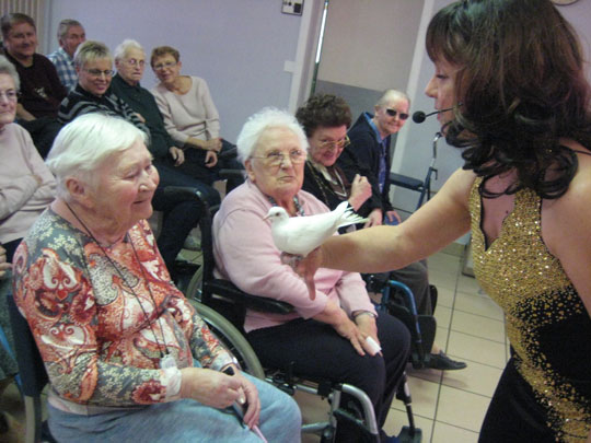 Erlina présente une séance magique, composée de numéros en tout genre. Grâce à une expérience de plus de 600 dates en Ehpad, Erlina offre un spectacle coloré et interactif, conçu pour les personnes âgées. Colombes, lapin, poisson, chien apparaissent pour le plus grand bonheur des résidents, lors de tours de magie animale. L'animation se poursuit avec des numéros tels que "la bague disparue" ou encore "le billet brulé, retrouvé". L'artiste propose également des tours de type "mentaliste" comme la lecture de pensée. Temps d'intervention : environ 1 heure Zone d'intervention : toute la France (organisation de tournées groupées) Recommandé par les Ehpad de Montcenis (Saône-et-Loire) et de Saint-Genis-de-Saintonge (Charente-Maritime) Coût présentation : 270 € Infos : http://www.magie-erlina.fr Contacts : mail : magierlina@aol.com - 03.84.82.19.17/ 06.23.28.91.94