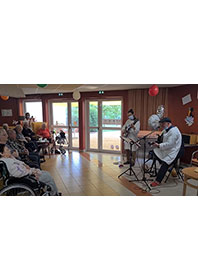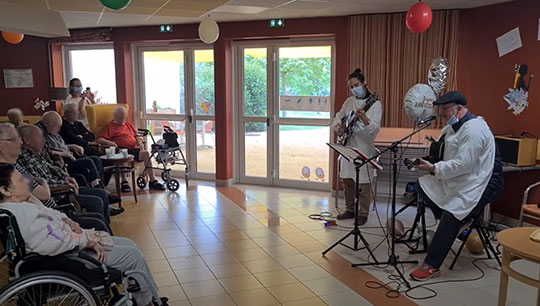 Dominique est un musicien de jazz, chansons françaises et swing. Il propose aux résidents un voyage musical avec un répertoire à la croisée des standards du jazz manouche de Django Reinhardt avec des chansons 50 et 60. L’occasion pour chacun de se replonger dans cette époque bernée de gaitée et d’insouciance. Selon les structures qui l’ont accueillies, ce musicien propose une séance de musique bien en lien avec le public âgé avec de belles interactions et qui permet de changer du répertoire habituel.