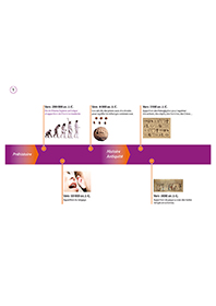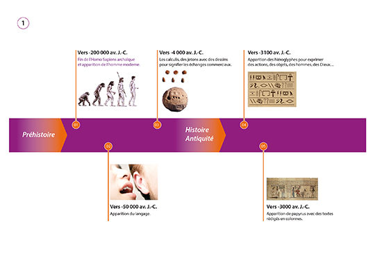 La frise chronologique comporte également des éléments liés à l’évolution des supports de l’écriture (argile, tablettes en bois, parchemin, papier, ordinateur) ainsi que des repères historiques (guerre, Révolution…).