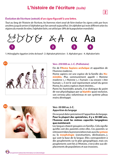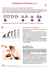 Ce support d’animation, composé d’une frise et d’une fiche animateur pour détailler chaque point chronologique, permet de comprendre l’évolution de la communication et la création de notre alphabet depuis l’Antiquité jusqu’à nos jours. Idéogramme, hiéroglyphes, écriture cunéiformes, sont des témoins importants de l’histoire de l’écriture à travers le monde.