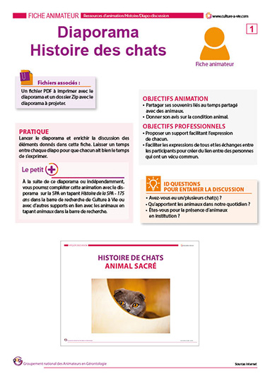 Ce diaporama est accompagné de sa fiche animateur. Il permet d’évoquer l’apparition du chat, son intérêt pour l’homme, l’évolution des races, la SPA, les chats préférés des Français... Un support à destination des amis des bêtes ainsi que des amoureux de nos fidèles compagnons poilus.