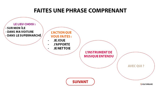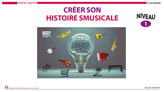 Cet atelier cognitif décliné sous la forme d’un diaporama sonore allie l’écoute des sons d’instruments de musique et la composition de phrases par les résidents. Trois diaporamas de niveaux différents sont proposés. Se remémorer, composer est un exercice qui demande attention et concentration mais aussi soutien et aide de la part du groupe : une activité divertissante et valorisante.