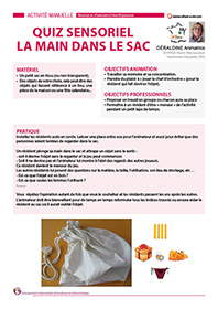 Géraldine, animatrice, propose un atelier sensoriel pour travailler sa mémoire et sa concentration. Les résidents deviennent à tour de rôle les meneurs du jeu en piochant des objets dans un sac que les autres doivent découvrir en posant des questions.
