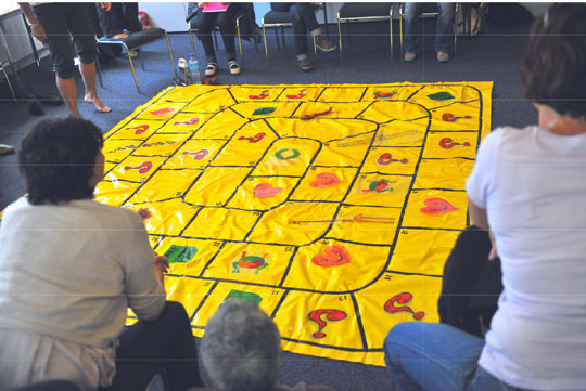 Ce jeu géant est créé sur un support de toile cirée. De grande dimension il permet de jouer à 4 groupes de personnes. Chaque groupe lance le dé et doit répondre à l’action sur laquelle il tombe : action de cœur, action de groupe, action culture générale ou action culture générale. Les cases et les défis sont modulables en fonction des saisons ou des thèmes définis. Bien encadré ce jeu créé par Patrick Mathieu, un animateur Suisse, est très vivant et permet à chacun de prendre du plaisir à relever les défis et à s’entraider.