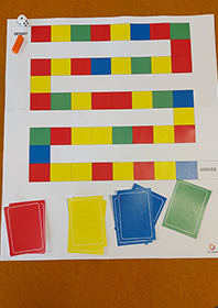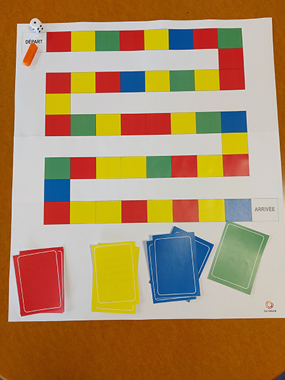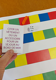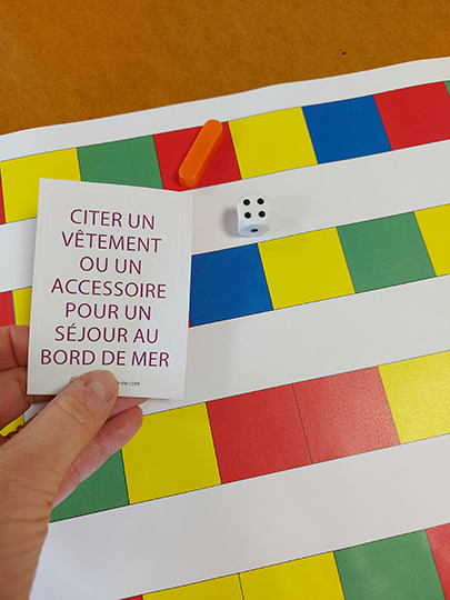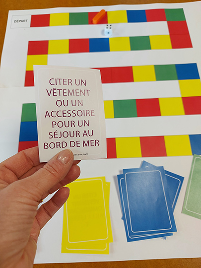 Le jeu plateau proposé ici par Christel permet de jouer en groupe autour du thème de l’habillement. Simple, avec des cases couleurs correspondant à des questions, ce jeu est facilement accessible. Des fiches d’aide aux réponses sont fournies dans la continuité des cartes à imprimer.
