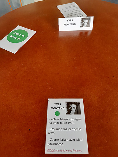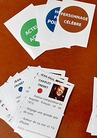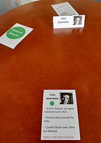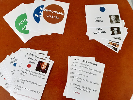 Inspiré du jeu Qui suis-je où les joueurs ont un post-it sur le front avec le nom d’un personnage célèbre qu’ils doivent découvrir en posant des questions, ce jeu intitulé Si j’étais... est décliné sous 4 thèmes (acteur/actrice - chanteur/chanteuse- homme/femme politique - personnage ayant marqué l’histoire). Des couleurs correspondent à chaque thème et des cartes d’aides aux questions et aux réponses sont proposées pour accompagner les joueurs si besoin. Pour éviter de coller un papier sur le front des résidents, des chevalets à poser devant eux permettent aux autres joueurs de connaître le nom de son personnage sans qu’il soit visible du joueur concerné. Lisez bien la règle du jeu pour comprendre la mise en place du jeu.