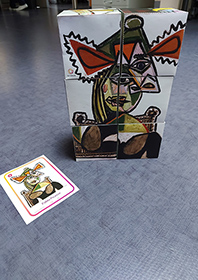 Ce support propose des dés à assembler de manière précise ou aléatoire pour se projeter en 3 dimensions et pour s’inviter dans l’univers de l’artiste cubiste.
