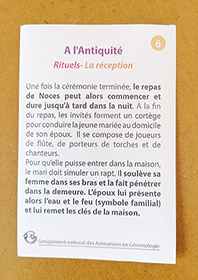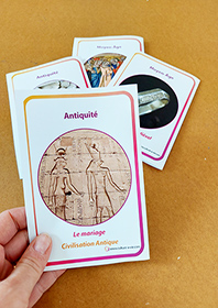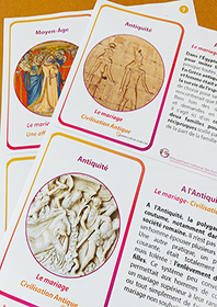 Ce jeu sur l’évolution du mariage au fil des siècles invite à la discussion autour de 32 cartes reprenant l’évolution des lois, des coutumes en faveur du mariage, elles retracent les changements que cet acte a pu subir depuis l’Antiquité à nos jours. Des cartes à positionner sur une frise chronologique pour mieux visualiser les périodes allant de l’Antiquité à l’époque contemporaine.