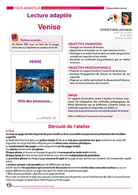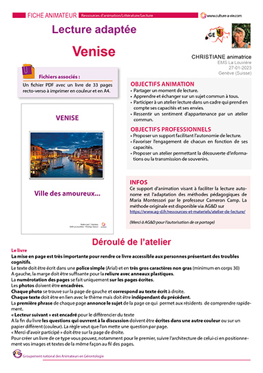 Ce livre, créé par Christiane, animatrice suisse, sur le thème de Venise, est destiné aux personnes présentant des troubles cognitifs tels qu’Alzheimer. Inspiré de la méthode Montessori, ce livre permet une lecture autonome lors d’un atelier lecture. Christiane donne, dans la fiche animateur la manière dont elle utilise ce support afin que chacun puisse se sentir valorisé et avoir un sentiment d’appartenance à un groupe.