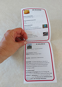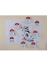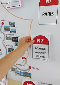 Retrouvez ici des cartes étapes en forme de borne où figurent des informations sur chaque ville étape de la Nationale de Paris à Menton. Ce support peut faire l’objet d’une exposition durant la période estivale. Vous trouverez ici une affiche pour annoncer l’atelier-discussion et une autre pour annoncer le lieu d’exposition.