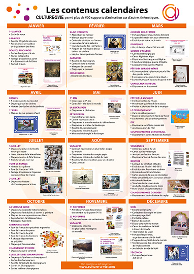 L’équipe de CULTUREàVIE a recensé pour vous les contenus présents sur la plateforme et qui peuvent rythmer vos animations en fonction du calendrier. Décomposé en 12 mois, ce calendrier à imprimer en A3 vous permet de suivre l’actualité (Saint-Valentin, 1er mai, 14 juillet, rentrée scolaire, Noël…) en détaillant les supports qui y sont liés (une liste non exhaustive puisque 2 à 3 nouveaux contenus sont mis en ligne chaque semaine). Un calendrier CULTUREàVIE à afficher dans le bureau d’animation !