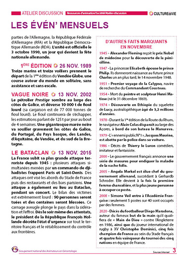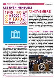 Ce contenu revient sur des événements qui se sont passés pendant les mois de novembre entre 1940 et 2020. Des événements pour lancer des débats et pour inviter les résidents de vos établissements à partager leurs souvenirs. Les résidents pourront laisser un écrit en dernière page sur un fait qui ne figure pas au contenu ou un témoignage sur un événement abordé.