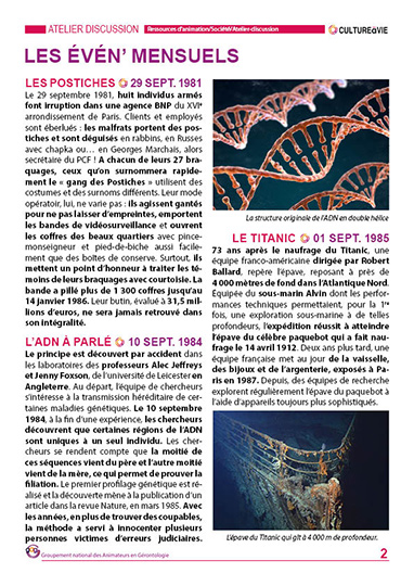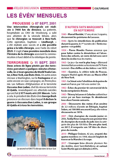 Ce contenu revient sur des événements qui se sont passés pendant les mois de septembre entre 1940 et 2020. Des événements pour lancer des débats et pour inviter les résidents de vos établissements à partager leurs souvenirs. Les résidents pourront laisser un écrit en dernière page sur un fait qui ne figure pas au contenu ou un témoignage sur un événement abordé.