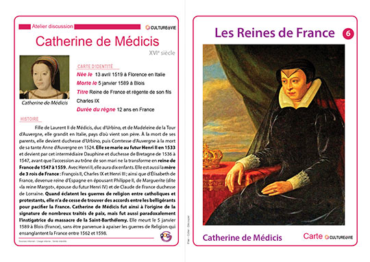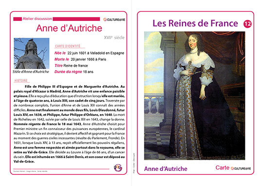 Ce support d’animation, présenté sous la forme de cartes, est dédié aux Reines de France qui ont marqué l’histoire du XIIe au XVIIIe siècle. Douze cartes détaillent la vie et le rôle de chacun de ces personnages historiques et permettent d’alimenter un atelier-discussion autour d’un thème apprécié des aînés.