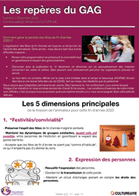 Comment gérer la période des fêtes de fin d’année 2020 ? L’organisation des fêtes de fin d’année est toujours un temps fort de l’activité des animateurs. Cette année, les conditions d’exercice de notre métier sont difficiles, c’est pourquoi nous proposons quelques repères simples et pratiques pour vous accompagner dans cette période délicate autour de 5 dimensions principales : festivités/convivialité, expression des personnes, solidarité professionnelle, médiation et professionnalisme, communiquer et informer.