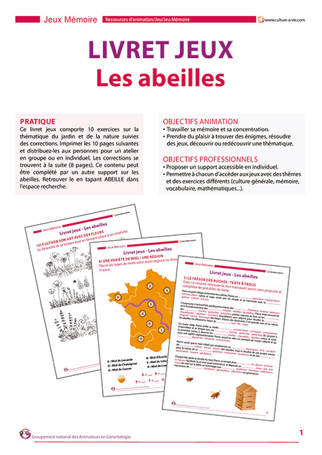 Pour célébrer la Journée mondiale de l'abeille (20 mai), quoi de mieux qu'un livret jeu à imprimer sur cette thématique. Texte à trous, sudoku, mots-mêlés, carte des miels de France, anagrammes ou encore suites logiques permettront aux résidents de travailler leur mémoire et leur concentration, tout en s'amusant. Les corrections sont données à la suite des questions. Ce contenu est adapté à l'animation individuelle. Ce livret nécessite une bonne capacité de réflexion.