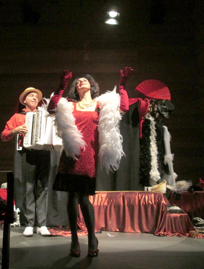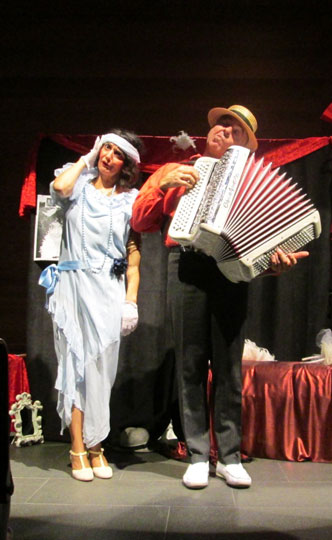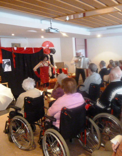 Un duo de professionnels de l'animation en Ehpad, composé d'une comédienne-chanteuse accompagnée de son accordéoniste offrent une représentation haute en couleurs. Un décor de cabaret des "Années Folles" attire déjà le regard des résidents : rideau noir et rouge, ombrelles, bibis et accessoires. Et Missdinguette arrive ! Avec ses boas, ses chapeaux, ses robes, son tralala et sa superbe voix, sans oublier sa fantaisie et sa drôlerie ! De la "Belle Époque" aux fameuses "Années Folles", un cabaret burlesque et chatoyant, représenté par les gloires de l’époque, telles que Mistinguett, Maurice Chevalier et bien d'autres dont les airs sont repris avec entrain par les résidents. Missdinguette et Arsène l'accordéoniste, aiment donner sans compter à leur public, à travers leur jeu de scène, leur énergie et les chansons émaillées de dialogues. Temps d'intervention : environ 1 h (possibilité de prestation plus longue lors d'animation d'un évènement tel que repas des familles, fêtes de fin d'année) Zone d'intervention : toute la France. Recommandé par les Ehpad de Tournon-sur-Rhône et d'Alboussière (Ardèche), l'Ehpad de La Redorte (Aude) Coût présentation : à partir de 360 € (hors participation frais de déplacement) Infos : http://missdinguette.over-blog.com/ Contacts : mail : missdinguette@live.fr - téléphone : 07.70.27.52.28 / 04.75.36.76.09 Pour les abonnés, la plaquette de l'artiste est à télécharger.