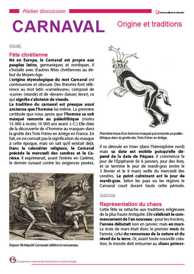 Delphine donne dans cette fiche les principaux éléments permettant de retracer l’histoire du Carnaval de ses origines à ses traditions. Ce support peut être utilisé en complément des autres contenus de CULTUREàVIE sur Carnaval à retrouver dans le menu « Ressources d’animation » Thème « Fêtes calendaires » Catégories « Carnaval ».