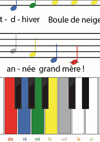 Mathieu propose un apprentissage de la lecture de la musique en couleurs. Chacune des notes colorées sur la partition correspond à une couleur reportée sur le clavier du piano. Cinq partitions de chansons connues sont proposées pour que les personnes âgées qui le souhaitent, puissent sans connaître le solfège, jouer de la musique et être mis en avant le temps d’un morceau. Pour plus de clarté vous pouvez mettre des gommettes sur les touches du piano.