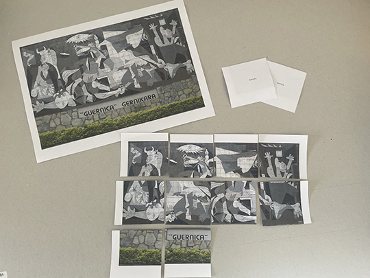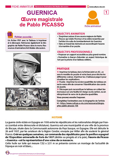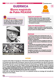 Ce support d’animation est dédié à l’étude d’une des œuvres majeures du peintre Pablo Picasso, Guernica. Cette huile sur toile en noir et blanc mesure 7,52 x 3,51 m et fait référence à la guerre civile de 1936 en Espagne. Ce contenu permet dans un premier temps d’étudier cette œuvre avec un commentaire détaillé des figures qui composent le tableau dans la fiche animateur. Dans un second temps vous pouvez imprimer le tableau dans la version puzzle à reconstituer.