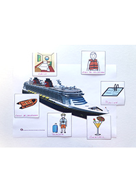 Il est question de se souvenir de l’utilité des objets en associant des pictogrammes à des visuels : avion, moto, bateau de croisière…. Autant de contenants à associer à des objets comme une valise, un casque, une cabine…