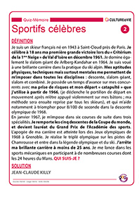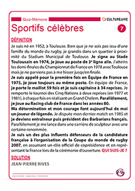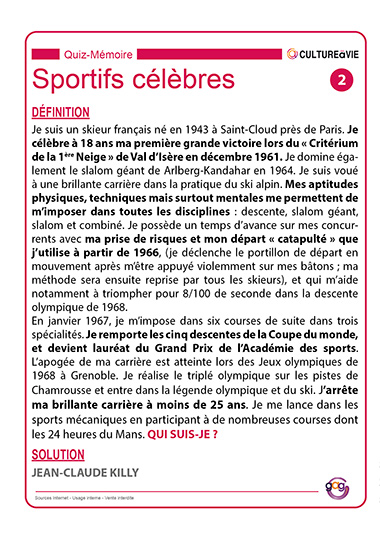 Reprenant le concept de contribution déposée par Virginie Dubois sur les célébrités, retrouvez ici un jeu sur les sportifs célèbres sous la forme d’un Qui suis-je ? Inspiré d’un célèbre jeu télévisé où l’animateur donne la définition d’un mot et où le plus rapide doit trouver la personne ou l’objet correspondant, ce support d’animation comporte 10 cartes comportant des éléments biographiques de 10 sportifs ayant connu leurs heures de gloire entre 1950 et 1970. Des photos permettent de donner un indice supplémentaire si les participants ne trouvent pas avec le texte. Ce support est adapté pour une activité de groupe ou en individuel avec une personne âgée passionnée de sports.