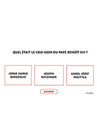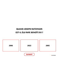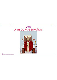 Suite au décès de l'ancien pape Benoît XVI, retrouvez les faits marquants de sa vie dans un diaporama quiz intéractif. Créé sous forme de QCM, la réponse à chaque question s'affiche en vert en un clic. (il faut cliquer sur les réponses proposées pour découvrir la bonne réponse qui s'affiche en vert).